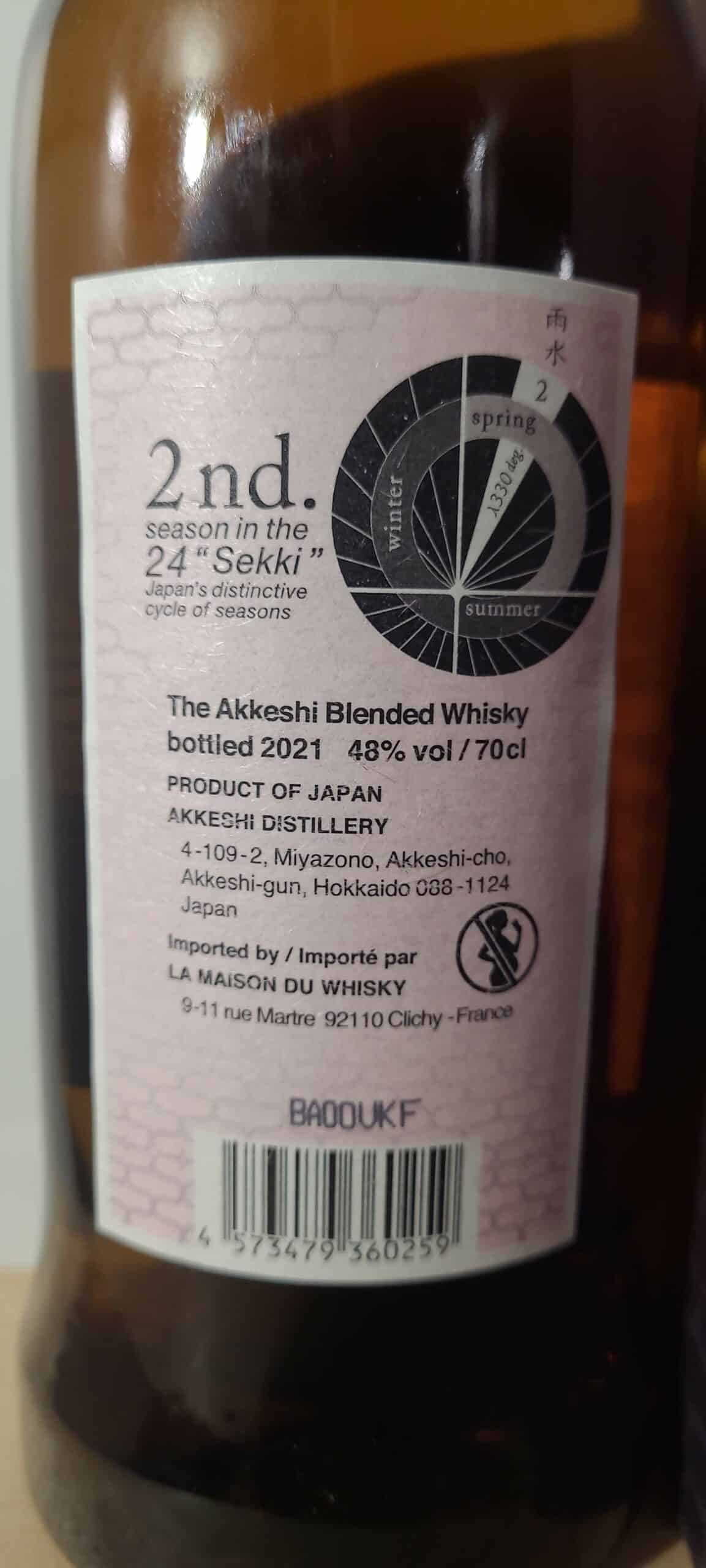 L’AKKESHI Blended Whisky Usui 48% est une expression raffinée de la distillerie Akkeshi, située dans le nord de l’île d’Hokkaido, au Japon. Ce whisky est le fruit d’un assemblage méticuleux de différents malts et grains, vieillis dans des fûts soigneusement sélectionnés. Le nom « Usui » fait référence au 2ème des 24 micro-saisons japonaises, marquant la fin de l’hiver et l’éveil de la nature. Ce whisky reflète cet équilibre entre la fraîcheur et la chaleur, une véritable célébration de l’artisanat japonais et de la nature environnante.