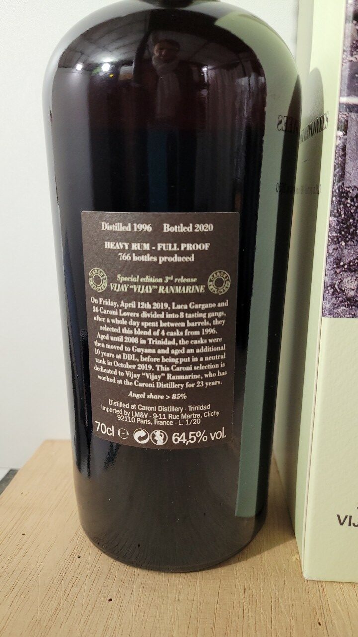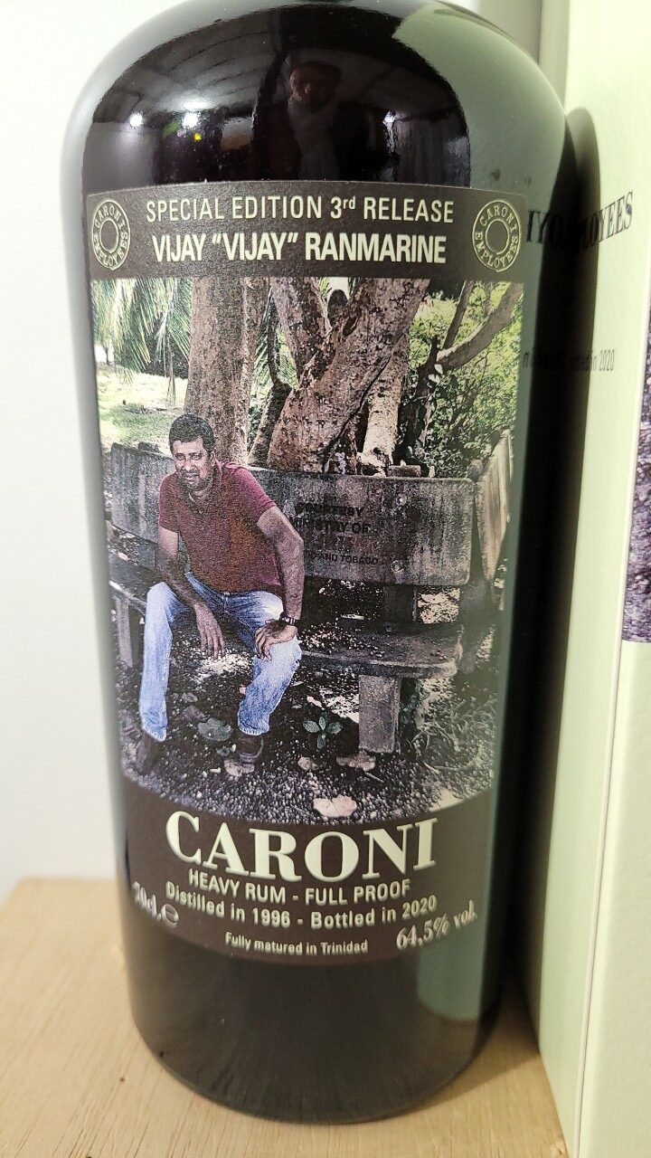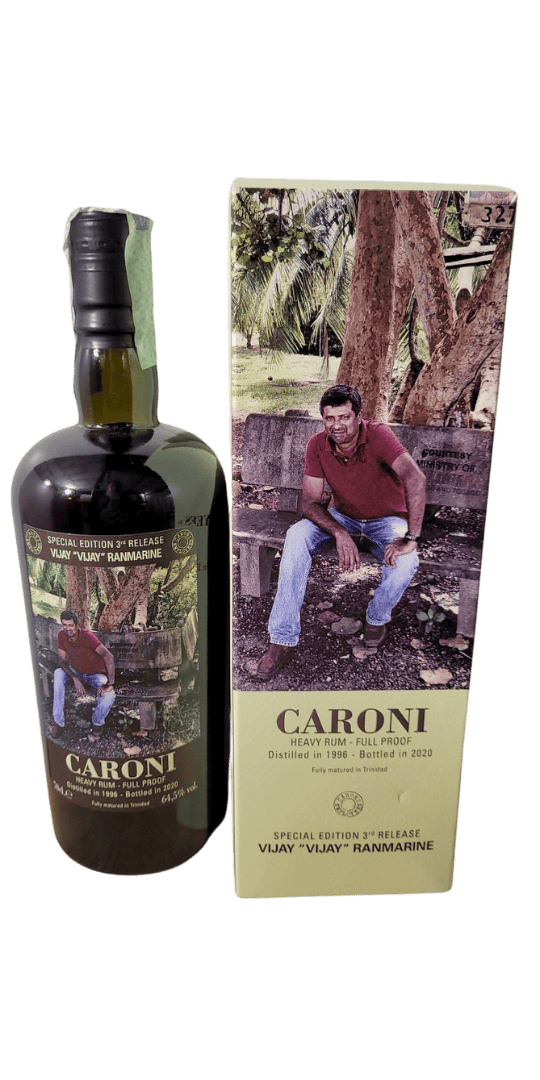 Le Caroni Employees Vijay ‘Vijay’ Ranmarine Full Proof Heavy Rum 1996 est un rhum d’exception issu de la mythique distillerie Caroni à Trinidad, fermée en 2002. Ce rhum fait partie de la célèbre collection « Caroni Employees », dédiée aux anciens employés de la distillerie, dont Vijay ‘Vijay’ Ranmarine, un personnage clé. Distillé en 1996 et embouteillé à un titrage impressionnant de 64,5%, ce rhum lourd (heavy rum) est un trésor rare et recherché, apprécié pour sa puissance et sa richesse aromatique.